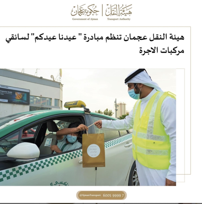 من منطلق استراتيجية هيئة النقل عجمان الى تعزيز المشاركة والحرص على ترسيخ القيم الانسانية خاصة في الاعياد ، تم تنظيم مبادرة " عيدنا عيدكم" لسائقي مركبات الاجرة في الامارة.